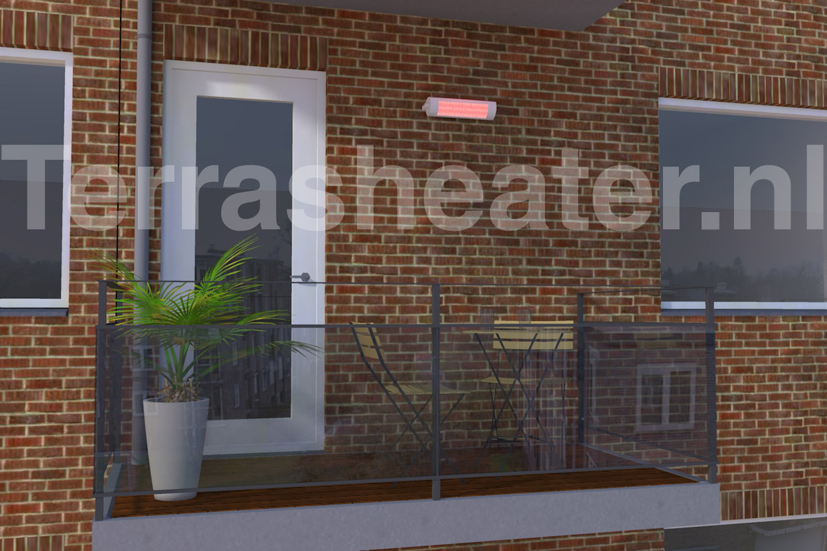 Op dit balkon heeft u voldoende aan een 1400 watt terrasverwarmer. Mits deze boven de tafel wordt geplaatst op een maximale hoogte van 2.10 meter. Zorg ervoor dat de u de straler goed door-kantelt zodat de straling op het balkon terecht komt en niet over u heen schijnt.